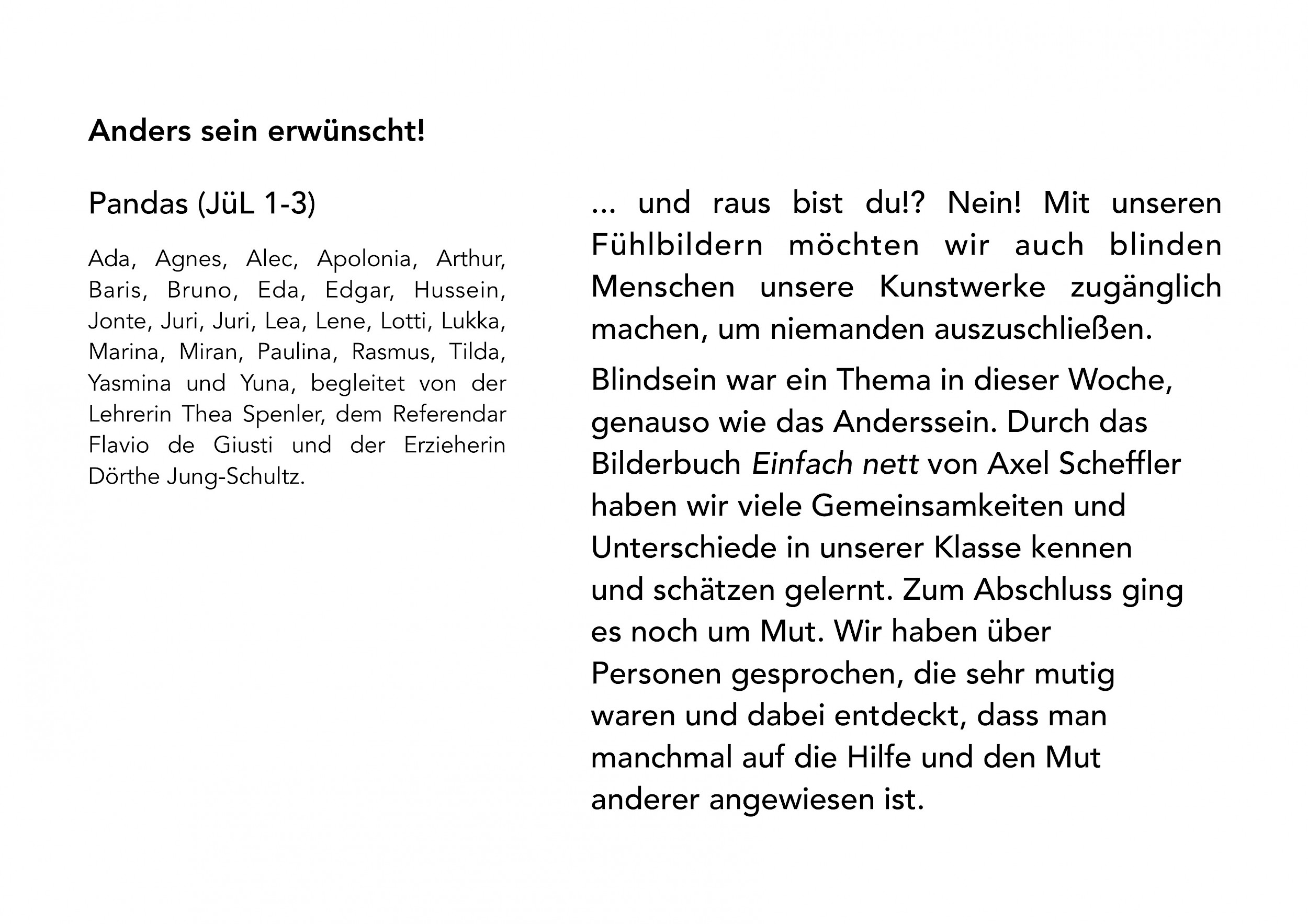 Die Ergebnisse der Projektwoche aus den verschiedenen Lerngruppen zeigte eine Ausstellung in der Temporären Galerie im Foyer der Quartiershalle auf dem Campus, die aufgrund der pandemischen Lage lediglich für Schulgruppen zugänglich war, und diese Online-Ausstellung.