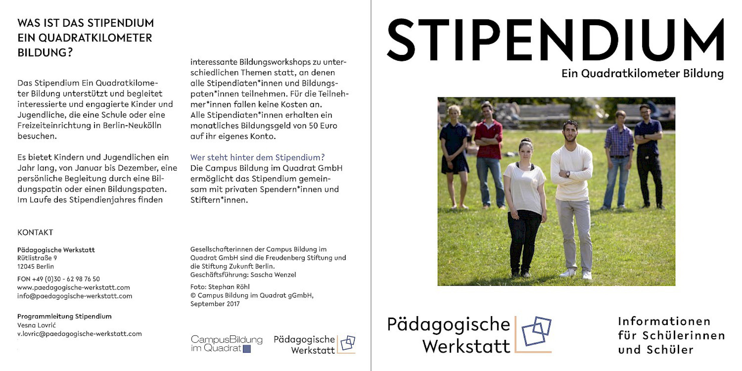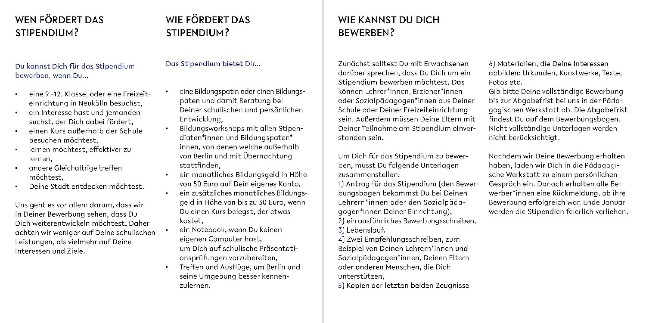 Mit ihren Bildungspatinnen und Bildungspaten erkundeten die Stipendiatinnen und Stipendiaten Berlin, tauschten sich über ihren Alltag, ihre Bildungswege und -ziele aus. Durch die Teilnahme an Bildungsworkshops lernten sich die Jugendlichen untereinander besser kennen und stärkten ihre sozialen und persönlichen Kompetenzen. Das monatliches Bildungsgeld ermöglichte es ihnen eigene Ziele zu verwirklichen. Die Mitarbeiterinnen der Pädagogischen Werkstatt begleiteten die Stipendiatinnen und Stipendiaten wie auch die Bildungspatinnen und Bildungspaten eng.